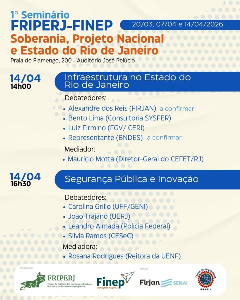 O FRIPERJ (Fórum de Reitores das Instituições Públicas de Ensino do Estado do Rio de Janeiro) e a FINEP (Financiadora de Estudos e Projetos) têm a honra de organizar o I Seminário FRIPERJ-FINEP: Soberania, Projeto Nacional e Estado do Rio de Janeiro, a ser realizado na FINEP (Praia do Flamengo, 200), nos dias 20/03, 07/04 e 14/04. O seminário conta com o apoio da FIRJAN (Federação das Indústrias do Estado do Rio de Janeiro) e do Clube de Engenharia.